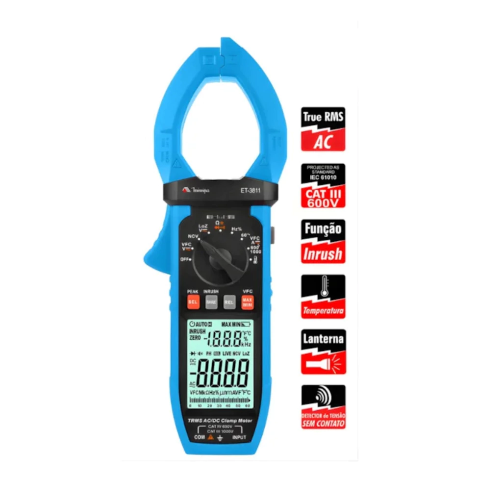 A classificação CAT IV 600V representa a máxima segurança para medições realizadas próximas à fonte de alimentação da instalação (entrada de serviço). Para o técnico que trabalha em painéis de força de chillers e grandes quadros elétricos, esta certificação no ET-3811 é a garantia de proteção superior contra picos de tensão e transientes perigosos.