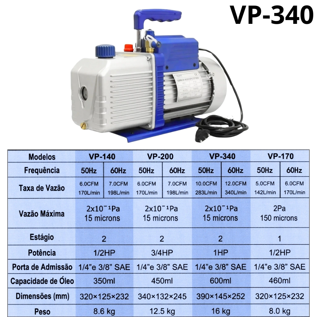 Bomba de Vácuo Duplo Estágio Profissional Vulkan 12 CFM 340 L/min 110/220V Bivolt - VP-340 - L54000046M