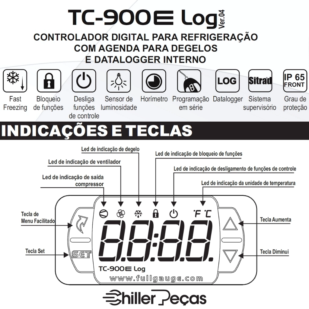 Controlador de Temperatura Termostato Full Gauge TC900EW LOG Bivolt (110/220V) com 2 Sensores Agenda para Degelos e Datalogger Interno