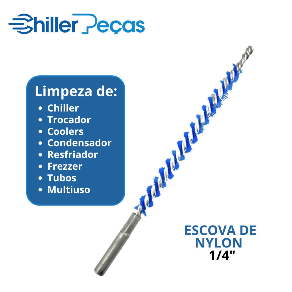 A Escova de Nylon 1/4" é projetada para a limpeza interna de tubos em sistemas de refrigeração e climatização, como trocadores de calor, condensadores, evaporadores, chillers e coolers. Sua ação rotativa e cerdas de nylon, remove incrustações, resíduos e biofilmes, restaurando a eficiência térmica dos equipamentos e prevenindo falhas operacionais, mantendo a eficiência térmica dos equipamentos e prolongando sua vida útil.