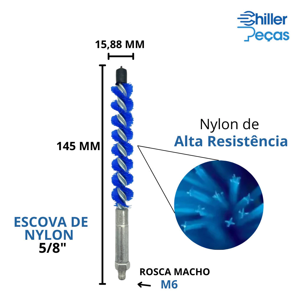 A Escova de Nylon 5/8" é projetada para a limpeza interna de tubos em sistemas de refrigeração e climatização, como trocadores de calor, condensadores, evaporadores, chillers e coolers. Sua ação rotativa e cerdas de nylon, remove incrustações, resíduos e biofilmes, restaurando a eficiência térmica dos equipamentos e prevenindo falhas operacionais, mantendo a eficiência térmica dos equipamentos e prolongando sua vida útil.