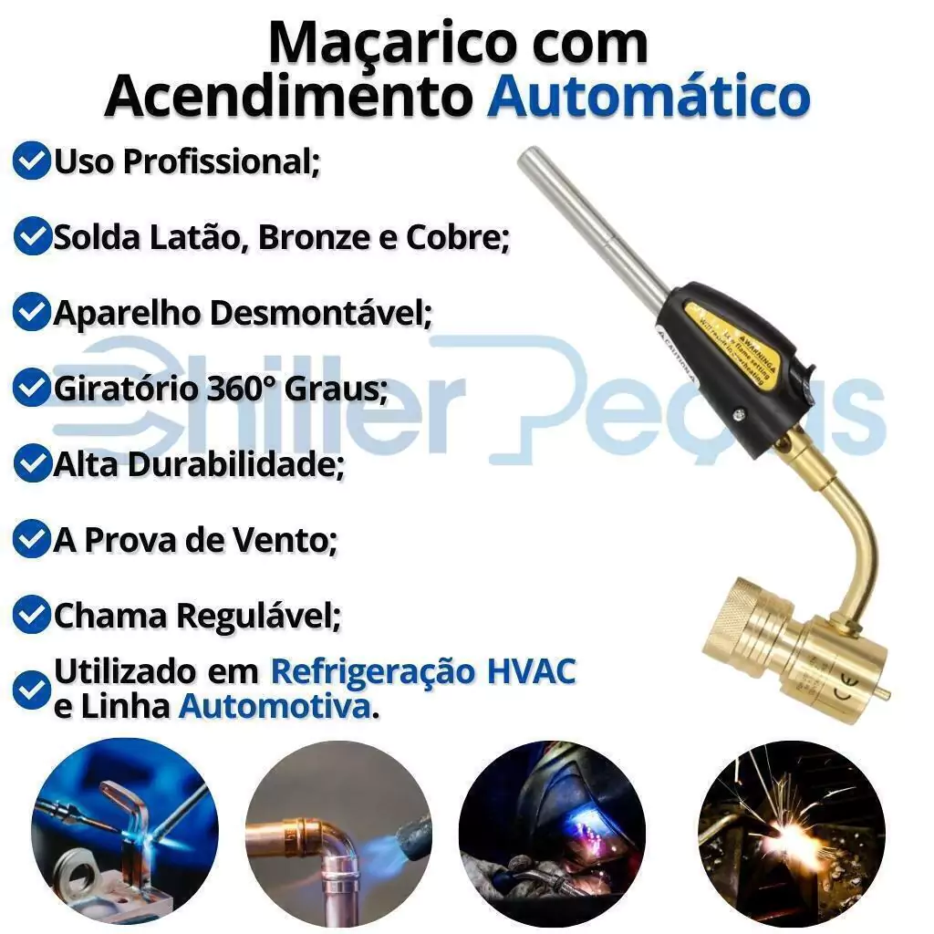 O Maçarico de Acendimento Automático é uma ferramenta utilizada para aplicar chama ou calor capaz de aquecer, soldar, fundir e cortar diversos tipos de materiais, especialmente metais como Cobre, Latão e Bronze e materiais de plásticos.