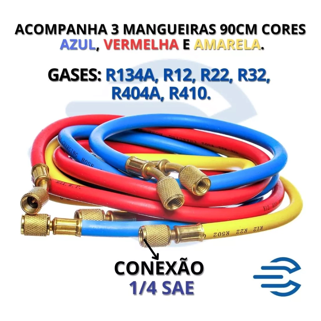 • Kit Manifold com Manômetro R22 R134a R410 R407 com 3 Mangueiras 90cm