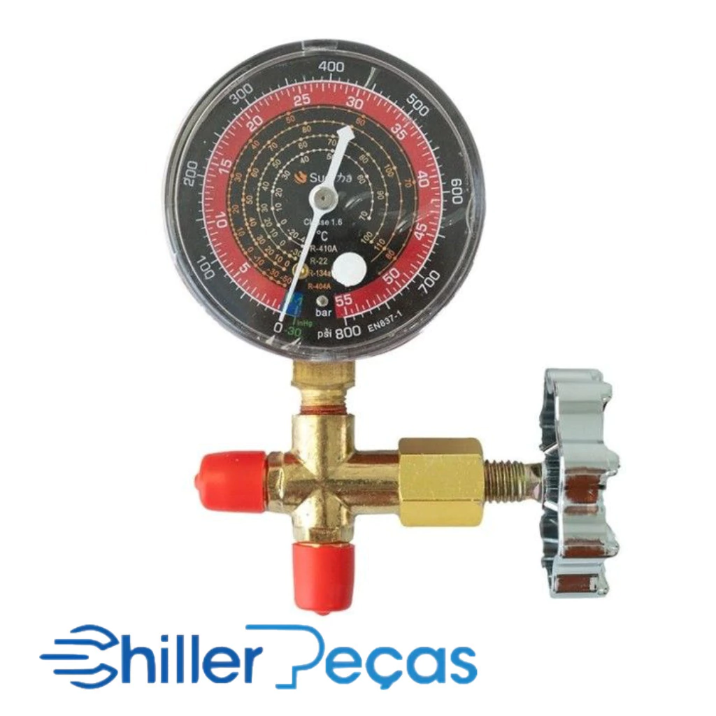 O Manifold 1 Via de Alta R22/R134/R404/R410 Suryha é utilizado para medir a pressão positiva dos principais fluidos refrigerantes no sistema durante a manutenção. Possui vedação dupla O'RING e perfeito controle de fluxo, garantindo precisão e confiabilidade. Seu corpo constituído em latão, aliado as capas de proteção para os manômetros, garantem resistência e longa vida útil.