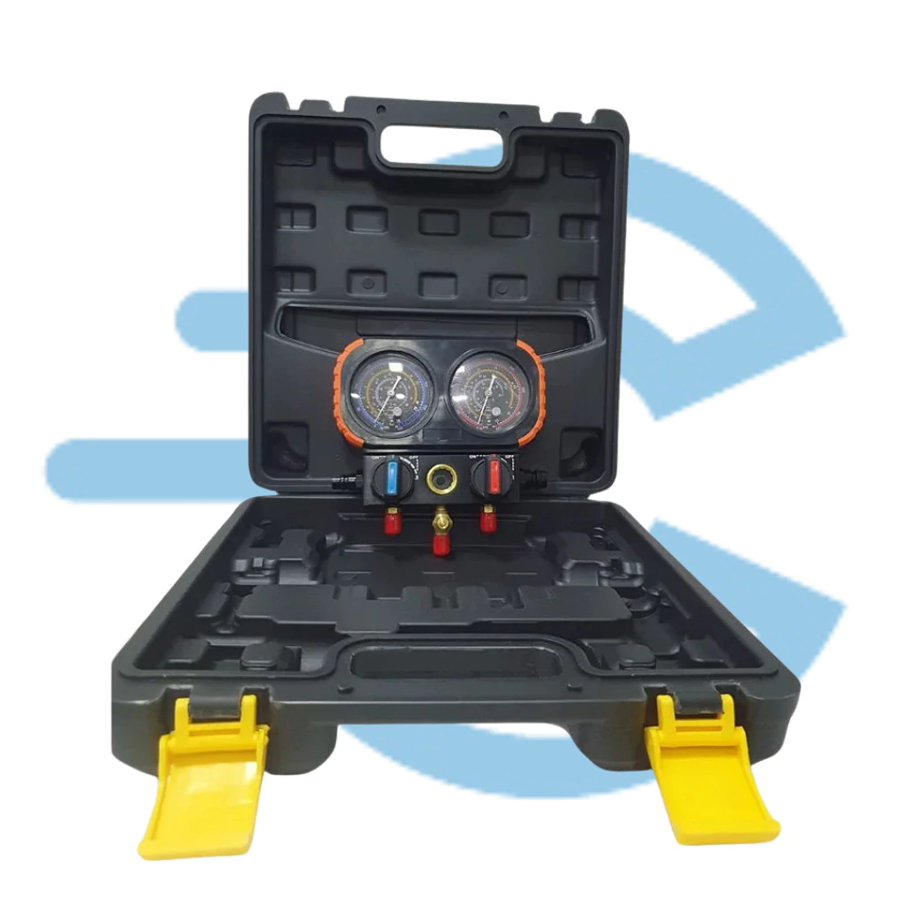 Manifold 2 Vias Premium para R134A, R22, R32 e R410A (sem mangueiras), ideal para medições de pressão positiva em sistemas de refrigeração durante a manutenção. Fabricado com proteção plástica de alta resistência, oferece durabilidade e segurança no manuseio. Seus manípulos garantem controle de fluxo preciso e confiável, proporcionando resultados mais exatos. Acompanha uma maleta prática e resistente para transporte seguro, facilitando o armazenamento e o uso em diferentes locais.