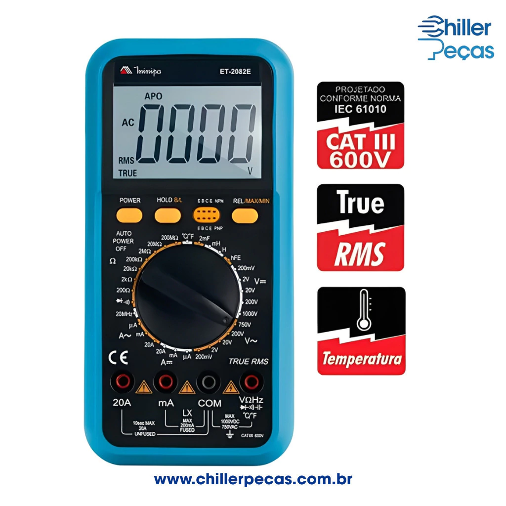 O ET-2082E mede corrente diretamente até 10A. Para correntes mais altas, típicas de compressores de chiller, você deve utilizar um alicate amperímetro específico, que também pode ser encontrado no catálogo da Chiller Peças.