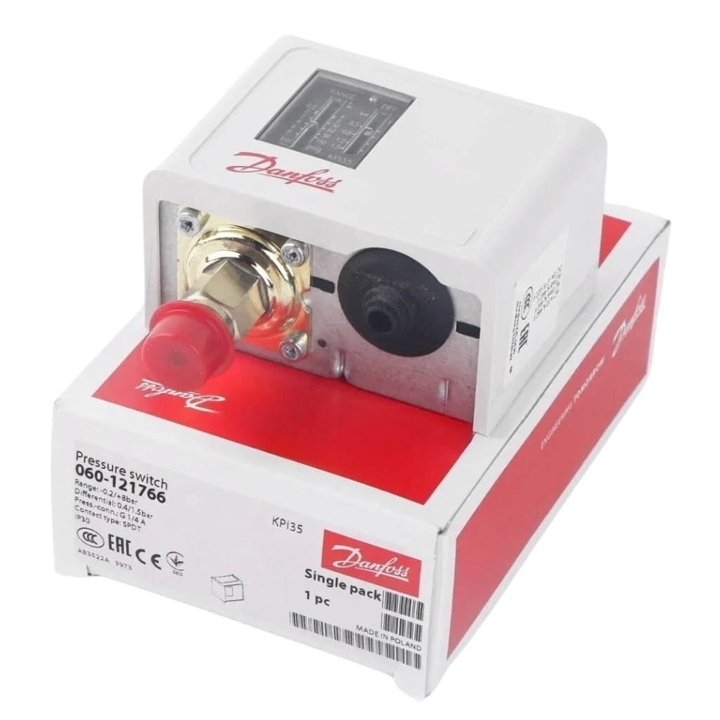 O Pressostato Danfoss 0,2 A 8 BAR, possuí diferencial ajustável de 0,4 a 1,5 BAR KPI35. Ideal para instalação em conexão com meio líquido e gasoso. Equipado com contato elétrico de polo simples (SPDT).